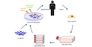 Các sản phẩm trong ngành Kỹ thuật mô và Y học tái tạo như: (a) xương nhân tạo, (b) mạch máu nhân tạo, (c) da nhân tạo, (d) van tim nhân tạo, (e) dây chằng nhân tạo và (f) tai nhân tạo.